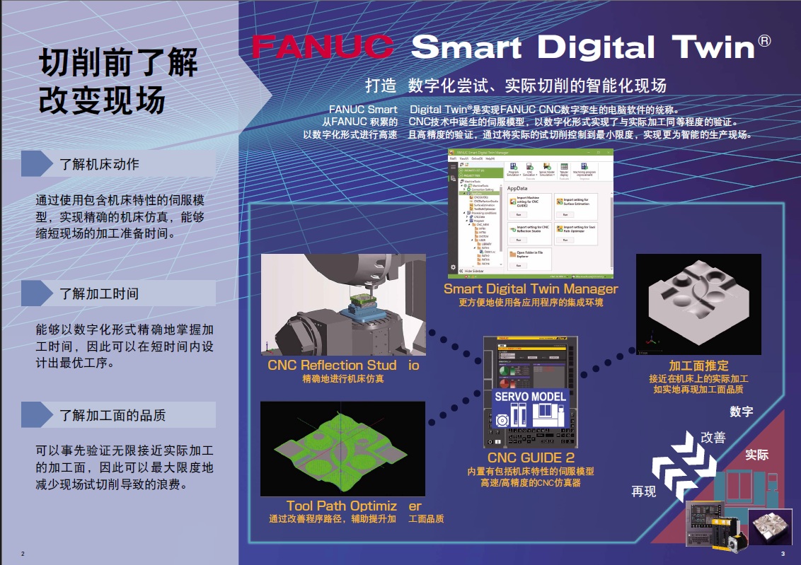 FANUC Smart Digital Twin®是實現FANUC CNC數位孿生的電腦軟體的統稱。 基於FANUC累積的CNC技術產生的伺服模型實現了與實際數位化加工相同程度的驗證。 它執行高速、高精度的數位驗證,以最大限度地減少實際試切,實現更智慧的生產工作空間。
